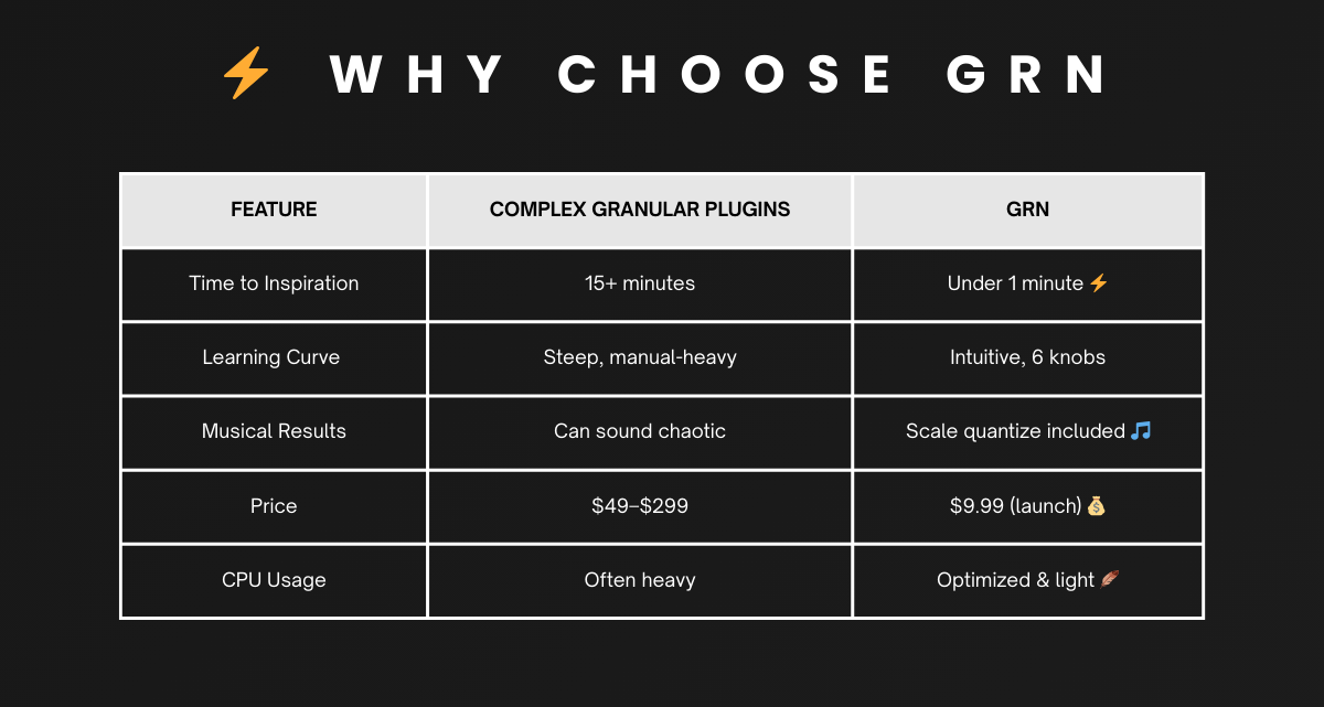 GRN turns any sound into evolving textures and glitchy rhythms. Six essential controls. Instant creative results. Perfect for ambient, electronic, and sound design. VST3 for Windows/Mac. Launch price: $9.99 (regular $29).